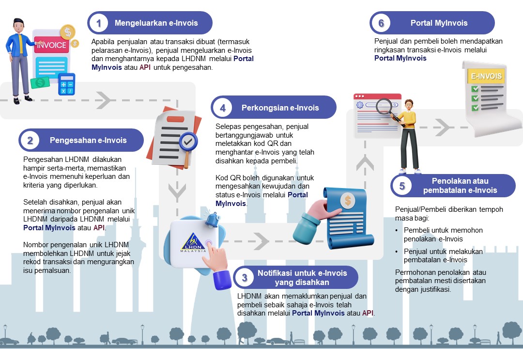Rajah di bawah menunjukkan gambaran keseluruhan aliran kerja pelaksanaan e-Invois. Ia bermula dari penyediaan e-Invois melalui Portal MyInvois atau API hingga ke proses penyimpanan dokumen e-Invois yang telah disahkan dalam pangkalan data LHDNM untuk pembayar cukai melihat sejarah e-Invoisnya.