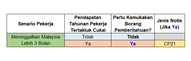 Sekiranya seseorang pekerja yang dikenakan cukai berkaitan dengan pendapatan daripada penggajian meninggalkan atau berhasrat meninggalkan Malaysia bagi suatu tempoh melebihi 3 bulan, majikan dikehendaki mengemukakan Borang CP21 tidak kurang daripada 30 hari sebelum tarikh pekerja dijangka berlepas.